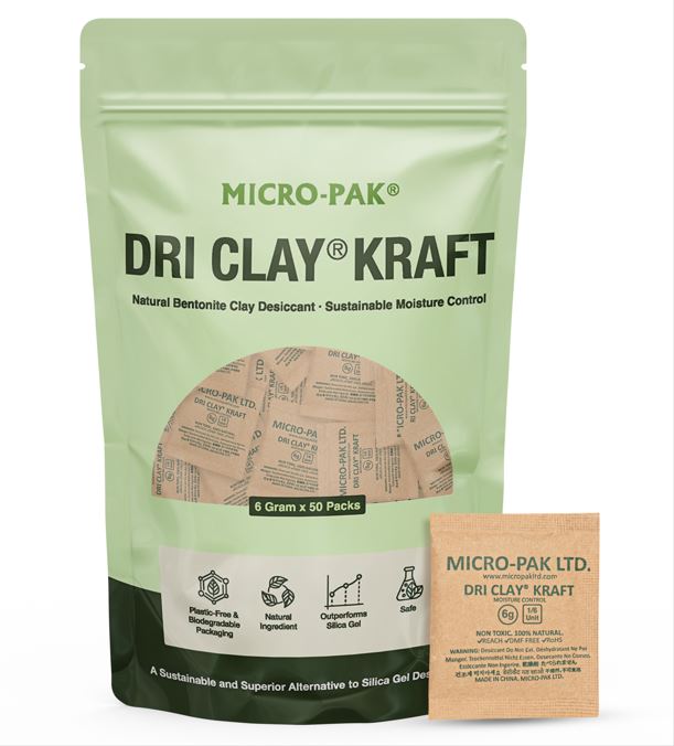 Micro-Pak Dri Clay® Kraft is a plastic-free desiccant made from 100% natural bentonite clay that is packaged in biodegradable, FSC-certified Kraft paper.